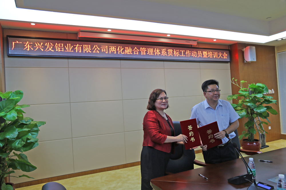 與會人員包括廣東省清潔生產(chǎn)協(xié)會會長及各技術(shù)工程師,興發(fā)高層領(lǐng)導(dǎo)及各職能部門負(fù)責(zé)人。會議期間,就推進(jìn)兩化融合管理體系的貫標(biāo)工作,公司特成立貫標(biāo)領(lǐng)導(dǎo)小組和工作小組,明確各小組成員及工作職責(zé),興發(fā)董事長劉立斌與協(xié)會會長黃建平簽署責(zé)任狀,旨在通過雙方通力合作完成兩化融合管理體系貫標(biāo)評定工作。.jpg)