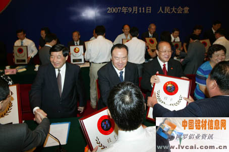 2007年中國名牌產(chǎn)品暨中國世界名牌產(chǎn)品表彰大會在京召開。圖為全國政協(xié)副主席白立忱(中),國家質(zhì)檢總局局長李長江(右)和黨組書記李傳卿(左)為受表彰企業(yè)頒牌。