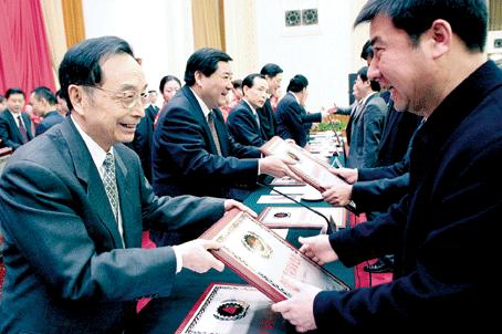 12月21日,在國家免檢產(chǎn)品頒證大會(huì)現(xiàn)場,全國人大常委會(huì)副委員長蔣正華(左一)、國家質(zhì)檢總局黨組書記李傳卿(左二)等領(lǐng)導(dǎo)正在為獲證企業(yè)代表頒發(fā)證書。 蔣正華李傳卿葛志榮蒲長城郭汝斌孫大偉劉平均宋明昌出席并為企業(yè)頒證